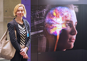 Professor Petra Ritter, director of the Brain Simulation section next to the Virtual Brain artwork I made. "I really like this artwork and I use it a lot to demonstrate that our research involves advanced mathematics and that neuroscience at that scale goes beyond reading EEG signals."