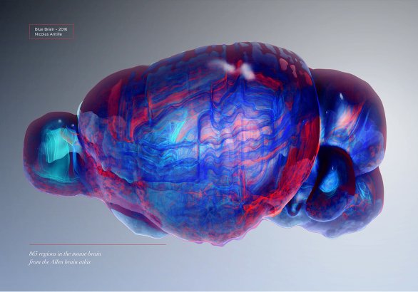 Complex datasets are often filtered by sampling/reducing the amount of visible elements. Here I tried to reveal all brain regions at once, with a work on transparency.