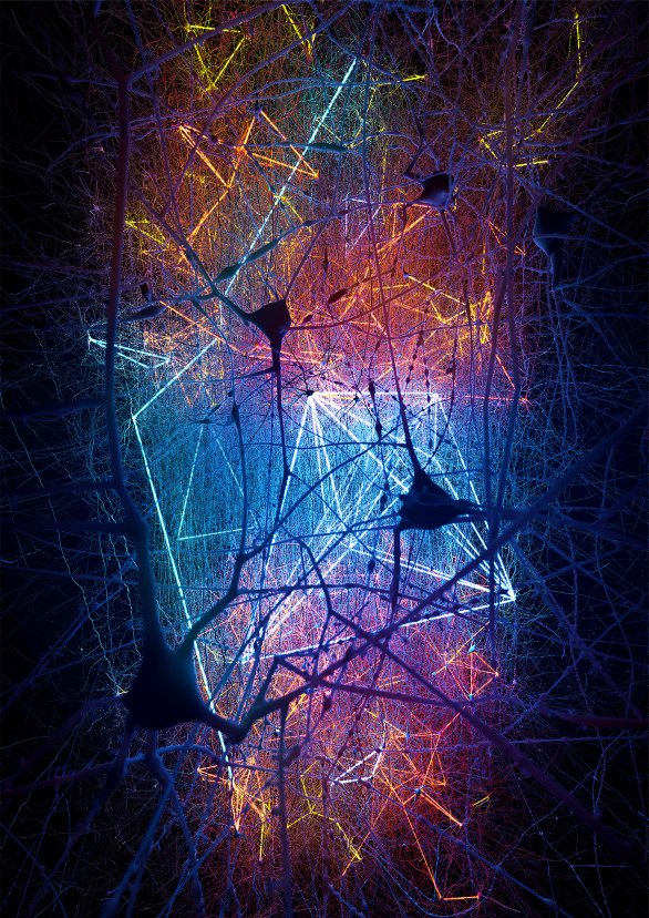 Illustration of algebraic topology applied to neuronal simulations at a given state. This is an artistic interpretation of the activity of the human brain from a connectivity standpoint.